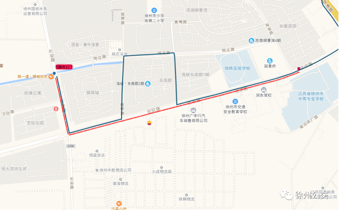 5路開往萬虹橋電子市場方向,由翡翠城發(fā)車后,經(jīng)長安路左轉(zhuǎn)進入欣欣路。
